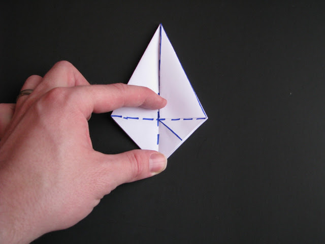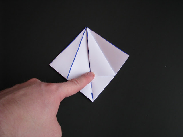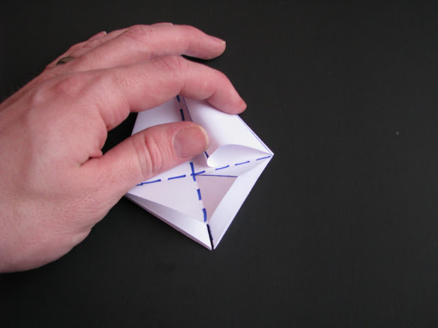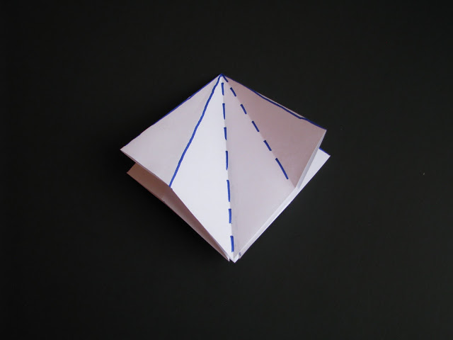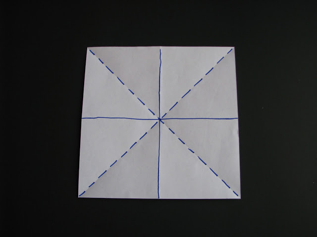 Feito isso, é hora de dar inícios às dobraduras fazendo as seguintes marcações no quadrado maior: