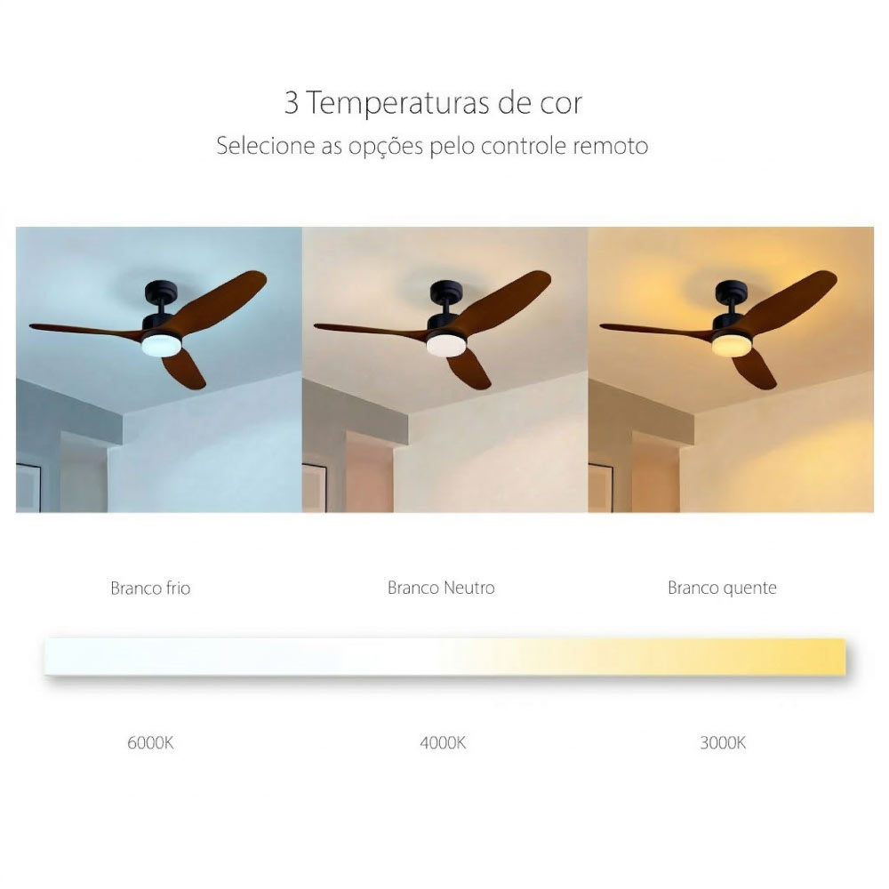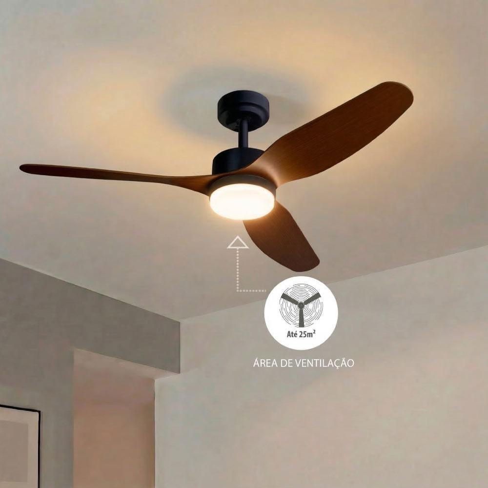 Além disso, alguns modelos contam com pás em madeira de origem certificada, trazendo um toque natural e sofisticado para o ambiente. A presença da madeira real valoriza a decoração e cria uma sensação mais acolhedora — é o tipo de detalhe que transforma o espaço de forma sutil, mas marcante.